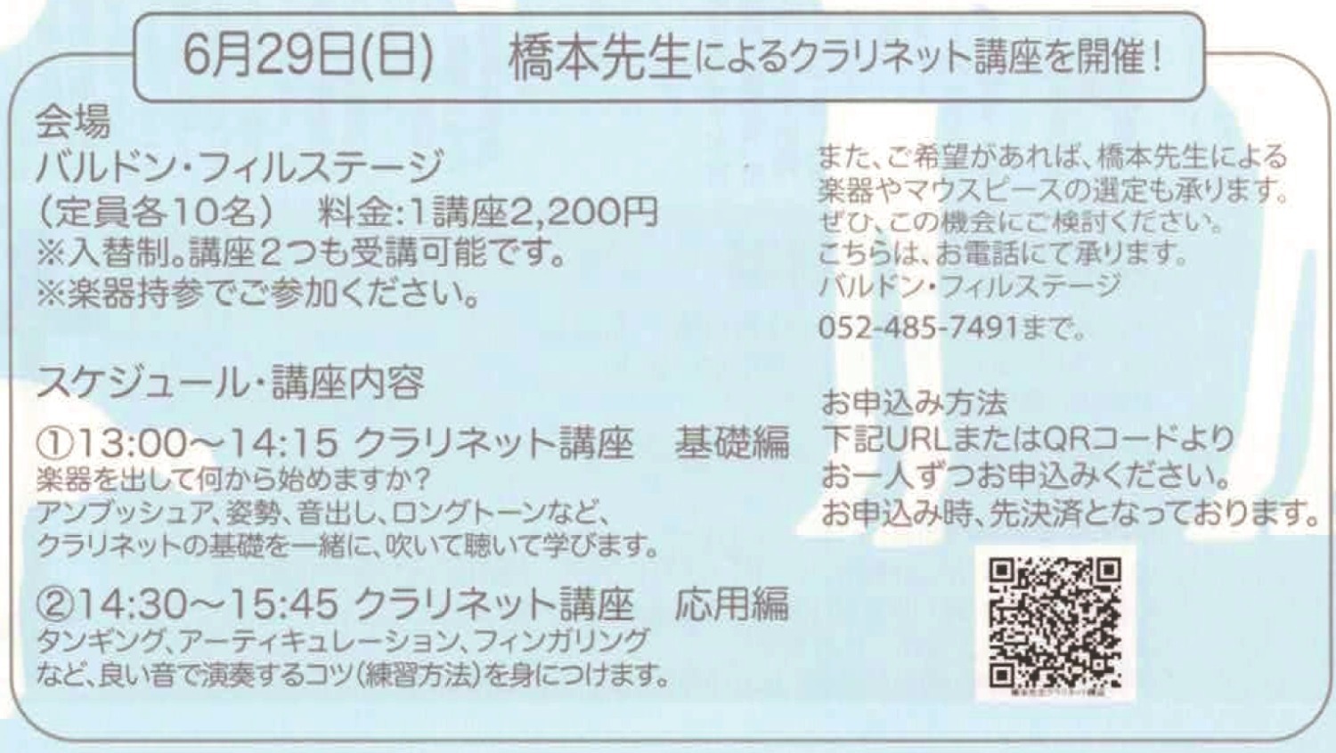 橋本眞介先生によるクラリネット講座を開催いたします。会場/講座情報